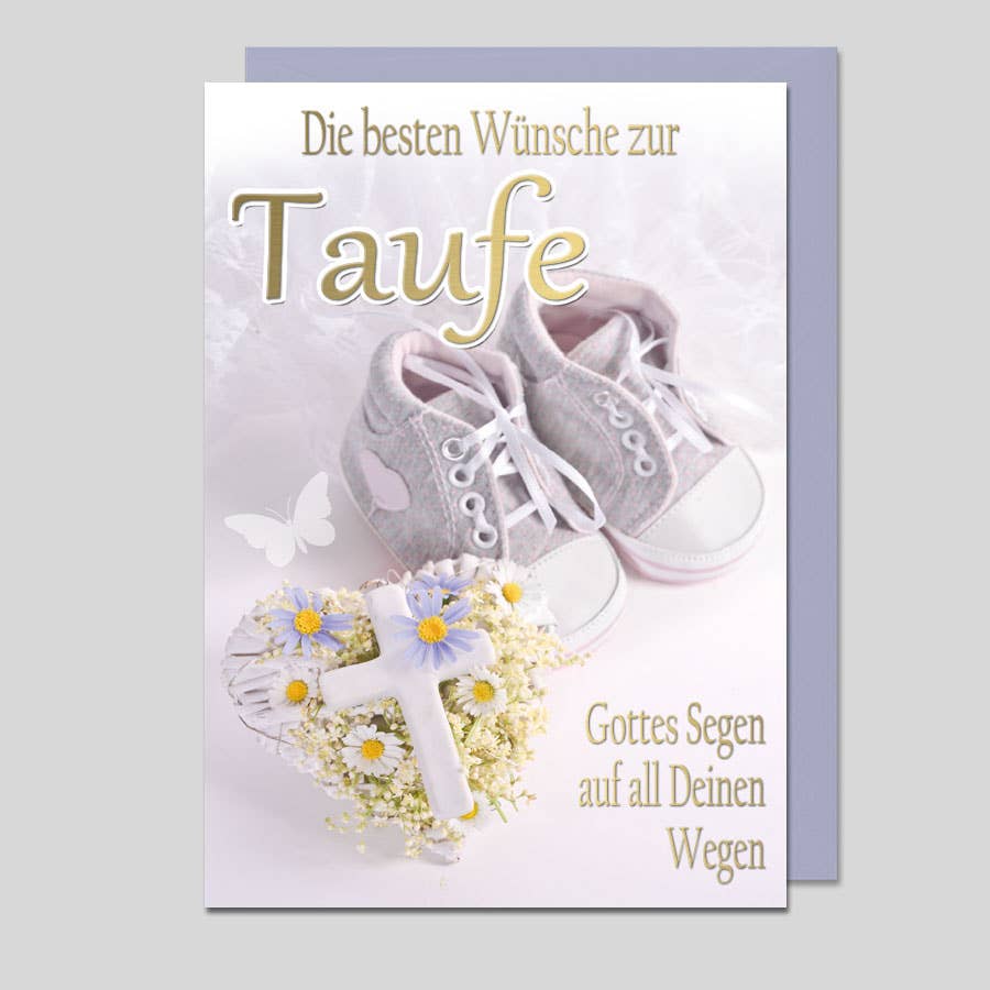 Glückwunschkarte "DIe besten Wünsche zur Taufe - Gottes Segen auf all Deinen Wegen ", Text in matt-goldener Heißfolie geprägt. Kartenformat 12 x 17 cm, Lieferung mit farblich passendem Briefumschlag.